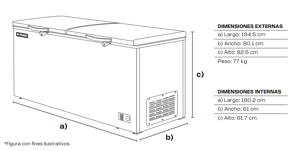 - Amplia capacidad: Ideal para almacenar grandes volúmenes de alimentos, carnes, mariscos y productos congelados.